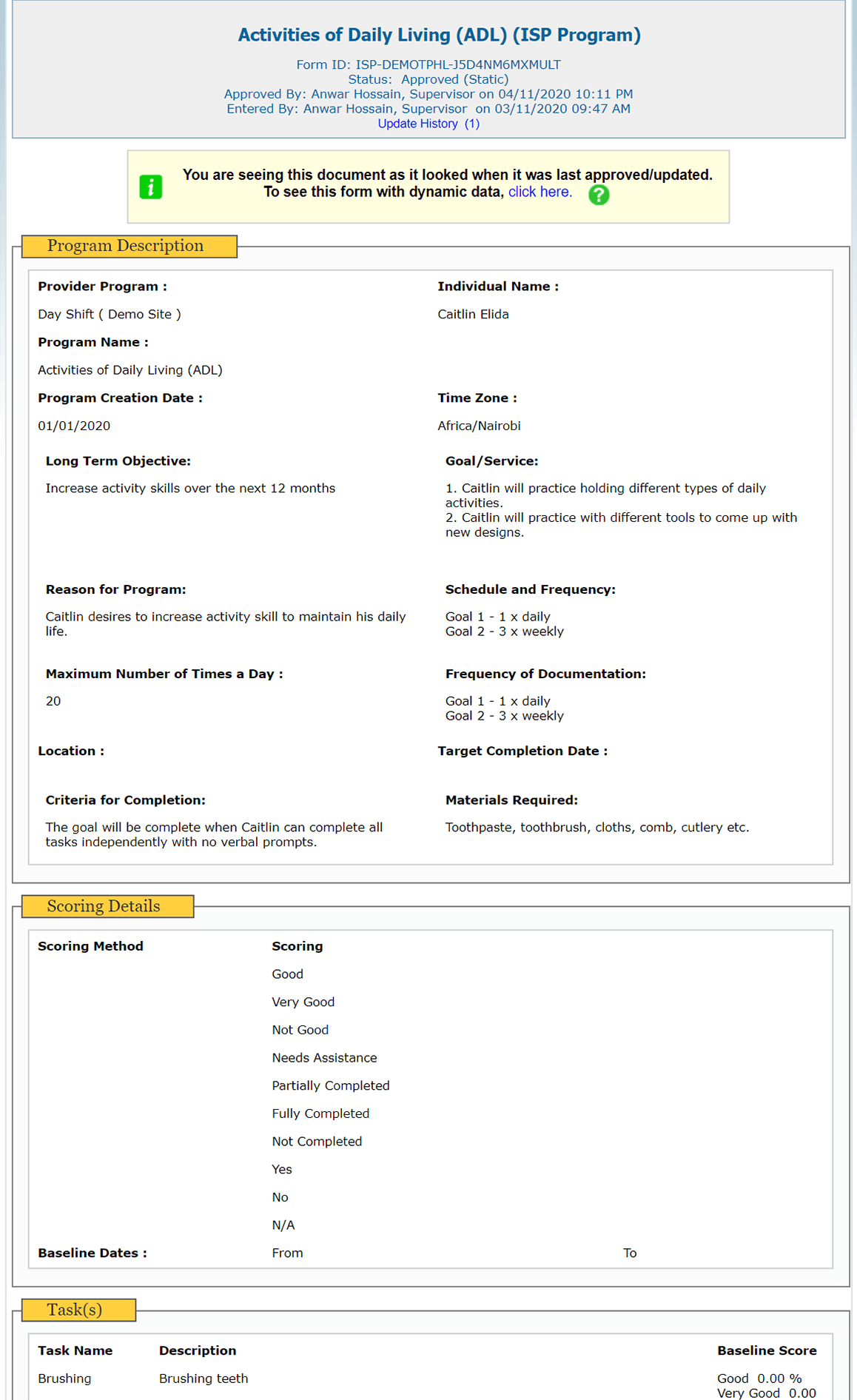 This report lists the days of a month and shows on which days services were provided against each task defined in the ISP Program along with links to particular documentation of the day and initials of the user who provided the service. - Data Collection Monthly